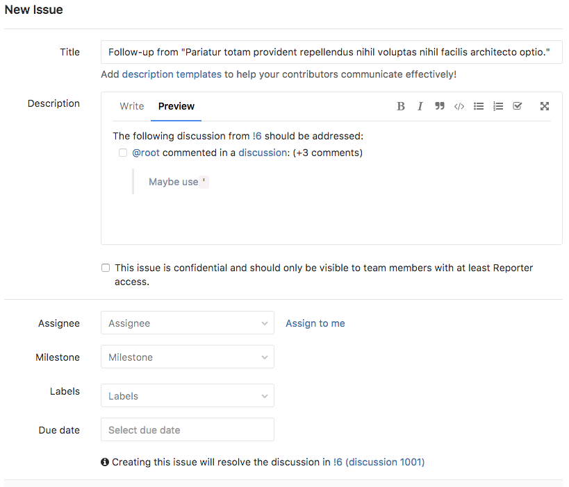 This will direct you to a new issue prefilled with the content of the discussion, similar to the issues created for delegating multiple discussions at once. Saving the issue will mark the discussion as resolved and add a note to the merge request discussion referencing the new issue.
