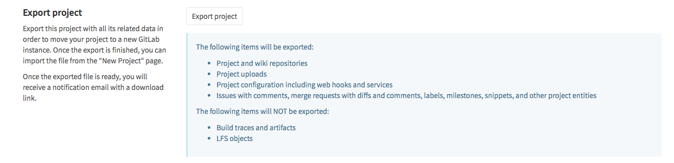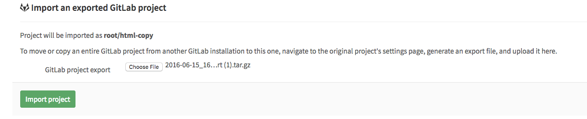 • For existing installations, the project import option has to be enabled in application settings (/admin/application_settings) under 'Import sources'. Ask your administrator if you don't see the GitLab export button when creating a new project.